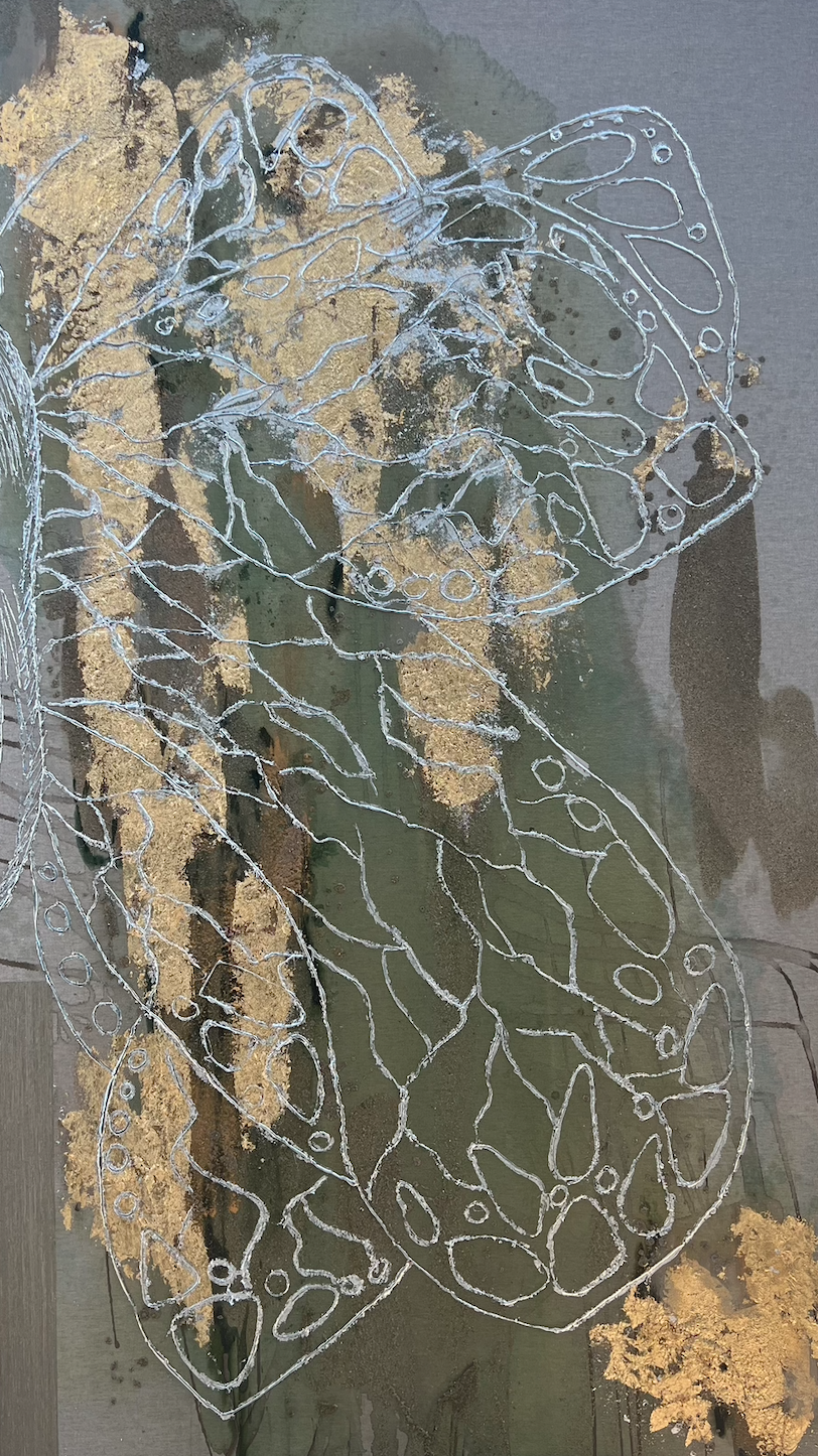 Acrylic, ink, sand, and silver leaf on canvas. 200 X 200 cm