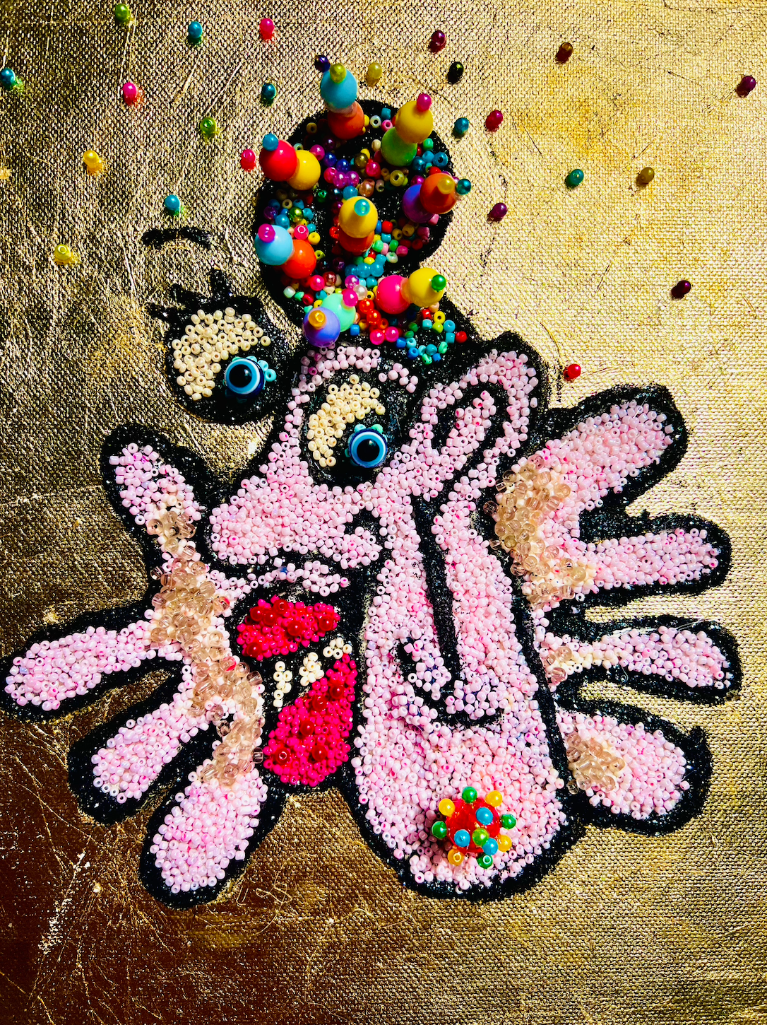 Beads and gold leaf on canvas. 40 X 40 cm.
